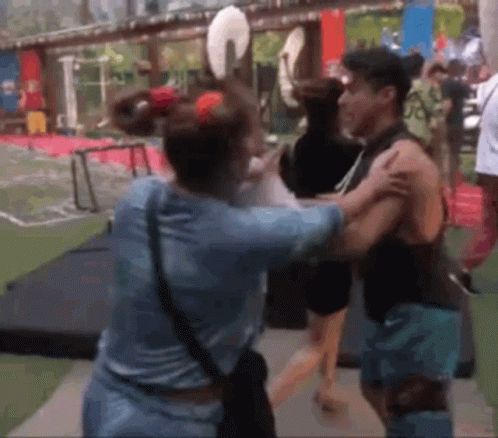 ഉള്ളടക്കത്തിന്റെ വിവരണം: a woman is hugging a man in a gym while a group of people are watching .