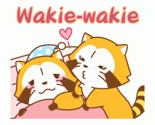 ഉള്ളടക്കത്തിന്റെ വിവരണം: two raccoons are laying on a bed with the words wakie-wakie written above them