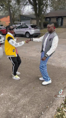 ഉള്ളടക്കത്തിന്റെ വിവരണം: two men are dancing on a sidewalk in front of a house while holding hands .