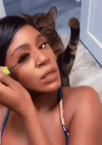 ഉള്ളടക്കത്തിന്റെ വിവരണം: a woman is applying mascara while a cat is sitting on her head .