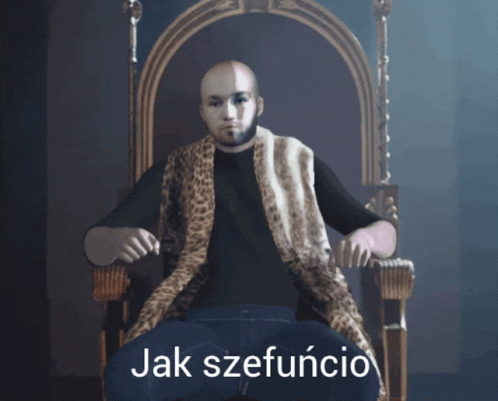 - ഉള്ളടക്കത്തിന്റെ വിവരണം: a man in a leopard print coat is sitting on a throne with the word jak szefunio written on the bottom