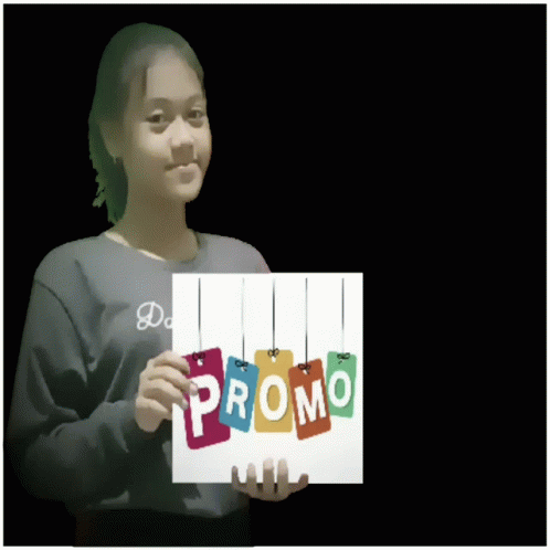 ഉള്ളടക്കത്തിന്റെ വിവരണം: a girl holds up a sign that says promo