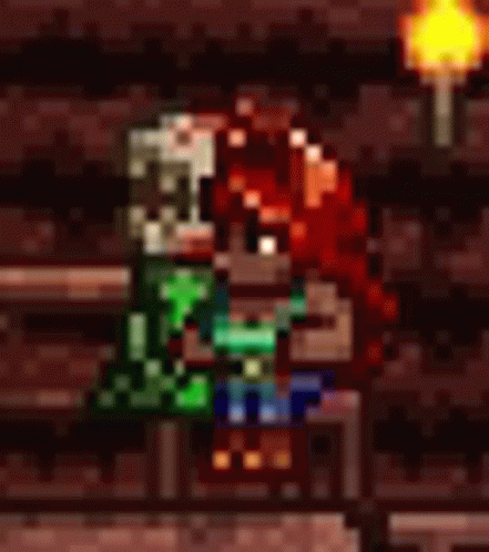 ഉള്ളടക്കത്തിന്റെ വിവരണം: a pixel art drawing of a person sitting on a bench with a torch in the background .