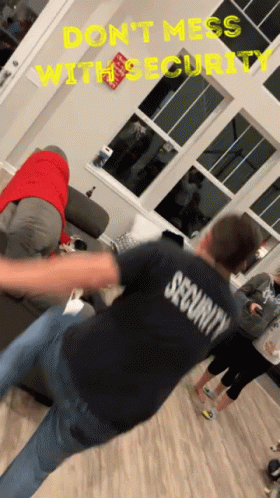 आशयाचे वर्णन: a man in a security shirt is kicking another man
