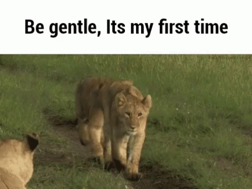 आशयाचे वर्णन: a lioness is walking through a grassy field with a caption that reads `` be gentle , its my first time '' .