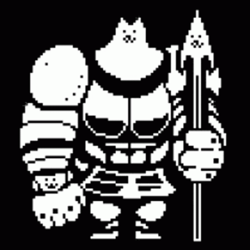 आशयाचे वर्णन: a black and white pixel art of a skeleton holding a spear and a dog .