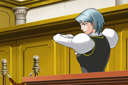 आशयाचे वर्णन: a cartoon drawing of a woman with blue hair sitting in a courtroom