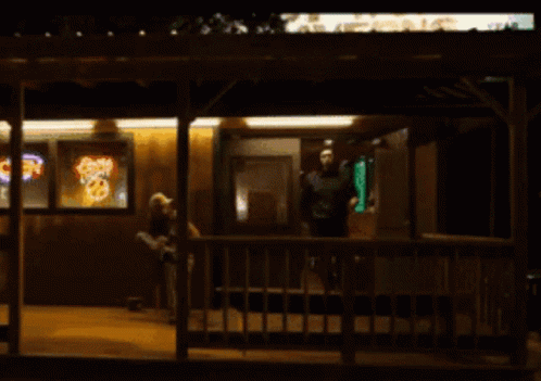 Perihalan Kandungan: a man stands on a porch in front of a store with a neon sign that says ' pizza '