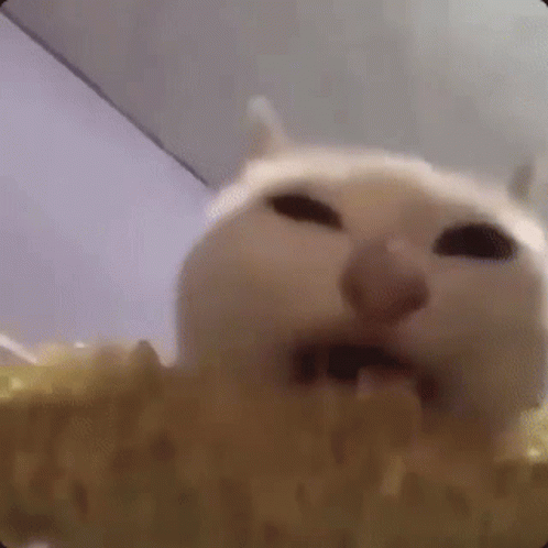 Perihalan Kandungan: a close up of a cat eating noodles with its mouth open .