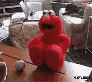 Perihalan Kandungan: elmo from sesame street is sitting on a table next to a ball and a laptop .