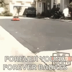 Perihalan Kandungan: a remote control car is driving down a street with the words `` forever young forever badass '' .
