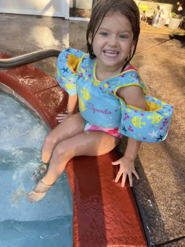 Perihalan Kandungan: a little girl wearing a speedo life preserver is sitting in a pool