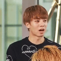 Perihalan Kandungan: a young man with red hair is wearing a black shirt with a heart on it and making a funny face .