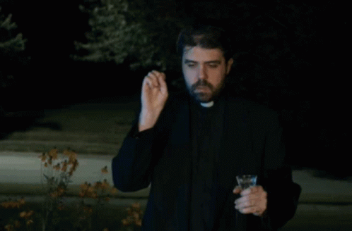 Perihalan Kandungan: a priest is holding a wine glass and making a funny face