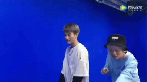 Perihalan Kandungan: two men are standing next to each other in front of a blue screen .
