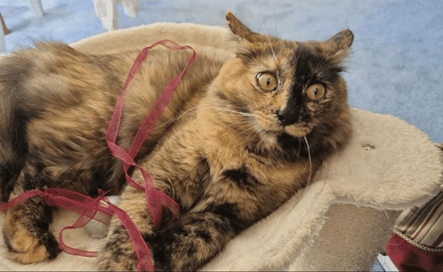 အကြောင်းအရာ ဖော်ပြချက်: a calico cat is laying in a cat bed with a red ribbon