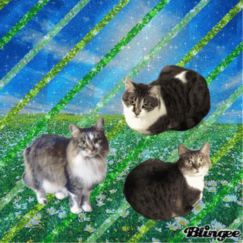 အကြောင်းအရာ ဖော်ပြချက်: three cats are sitting in a field with green stripes