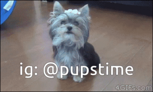 Innholdsbeskrivelse: a small dog with a bow on its head is sitting on a wooden floor with the words ig : @pupstime below it