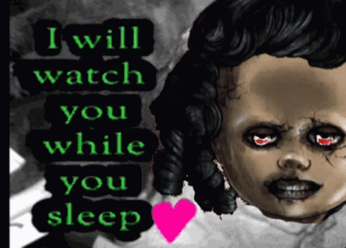 Innholdsbeskrivelse: a picture of a creepy doll with the words " i will watch you while you sleep " above it