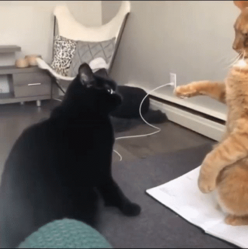 सामग्रीको वर्णन: a black cat and an orange cat standing next to each other