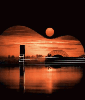 सामग्रीको वर्णन: a guitar with a sunset in the background and a full moon
