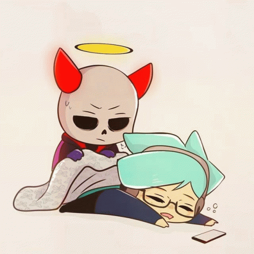 सामग्रीको वर्णन: a cartoon drawing of a skeleton with red horns and a girl with blue hair