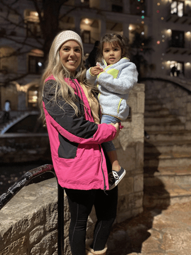 අන්තර්ගත විස්තරය: a woman in a pink jacket is holding a little girl in her arms