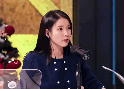 අන්තර්ගත විස්තරය: a woman wearing headphones stands in front of a microphone with a christmas tree in the background