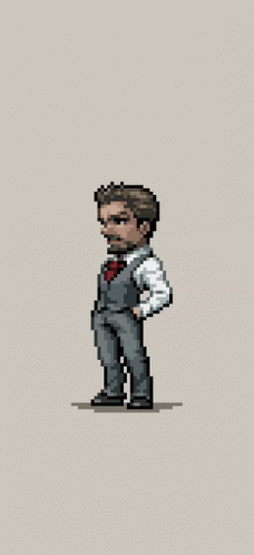 අන්තර්ගත විස්තරය: a pixel art of a man in a suit and tie holding a red glove