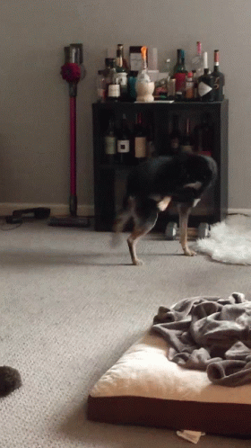 අන්තර්ගත විස්තරය: a dog standing in front of a shelf full of bottles of alcohol