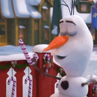 අන්තර්ගත විස්තරය: a snowman with a carrot in his mouth is holding a candy cane .