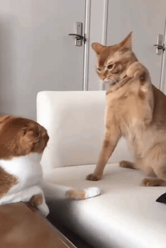 අන්තර්ගත විස්තරය: two cats are playing on a white couch and one is scratching the other