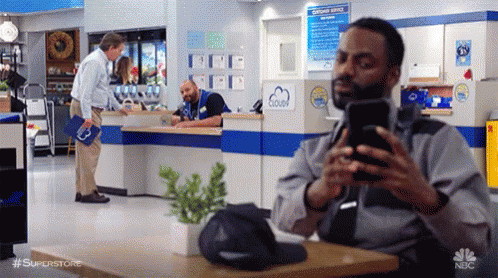 අන්තර්ගත විස්තරය: a man is sitting at a table looking at his cell phone in a store .