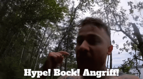 Opis obsahu: a man in a forest with the words hype bock angriff written below him