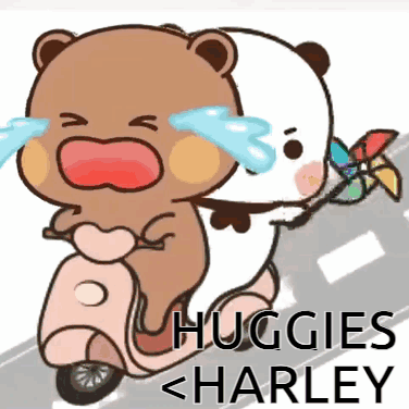 Opis obsahu: a couple of bears are riding a scooter on a road and hugging each other .