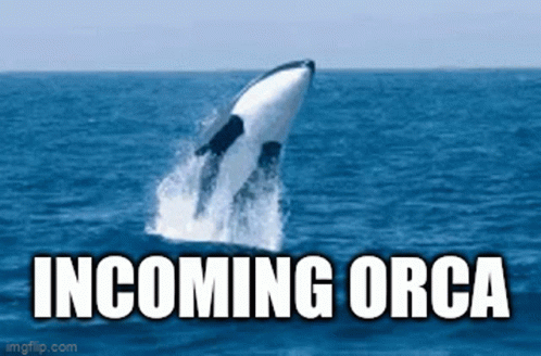 Opis obsahu: a picture of a whale jumping out of the water with the words incoming orca below it