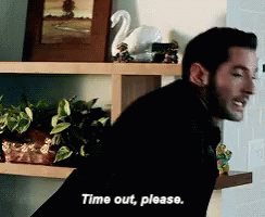 Opis obsahu: a man says time out please in front of a shelf with a swan on it