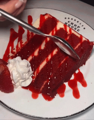 Opis obsahu: a slice of red velvet cake on a plate with brooklyn chop house written on the plate