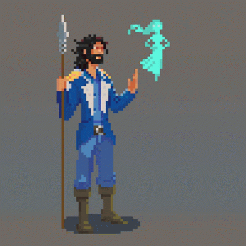Opis obsahu: a pixel art of a man holding a spear and a ghost