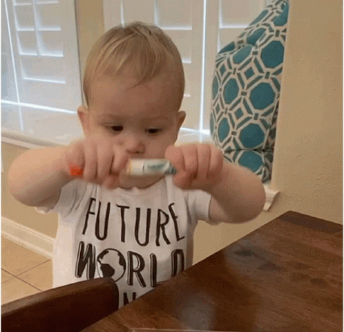 Opis vsebine: a baby wearing a future world shirt brushes his teeth with a toothbrush