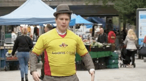 Përshkrimi i përmbajtjes: a man wearing a hat and a yellow shirt that says loans co.uk