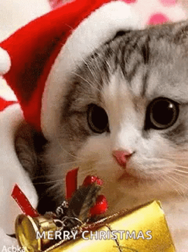 Përshkrimi i përmbajtjes: a cat is wearing a santa hat and holding a christmas present .