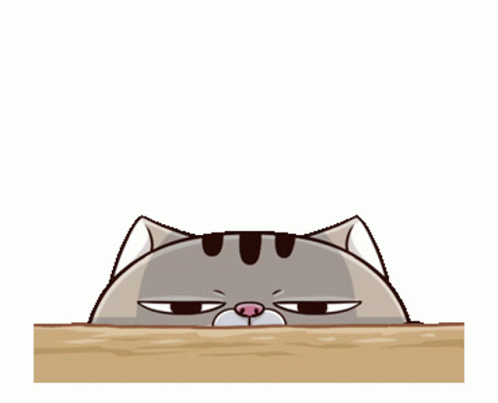 Përshkrimi i përmbajtjes: a cartoon cat is sitting on a wooden table and making a funny face