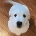 Përshkrimi i përmbajtjes: a white dog is sitting on a wooden floor looking up at the camera .