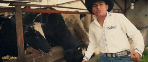 Përshkrimi i përmbajtjes: a man in a cowboy hat stands in front of a herd of cows with a sign that says nibikoos