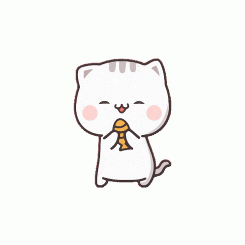 Përshkrimi i përmbajtjes: a cartoon drawing of a white cat holding a fish in its mouth