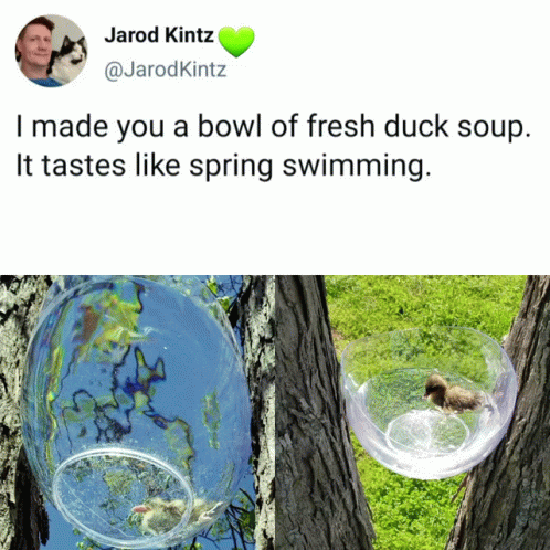Përshkrimi i përmbajtjes: a tweet by jarod kintz shows a duck in a bowl of fresh duck soup