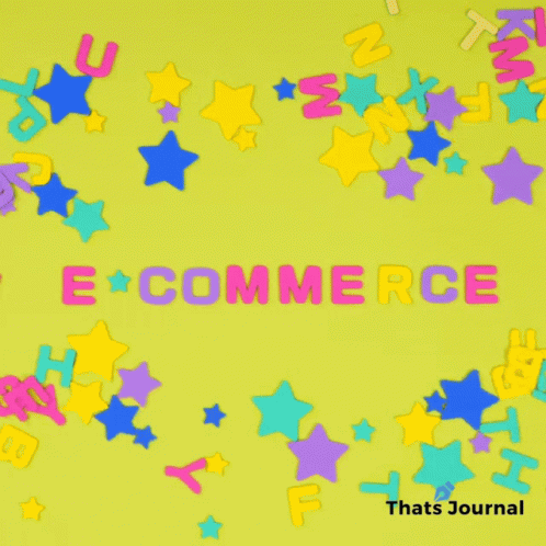 Përshkrimi i përmbajtjes: the word e-commerce is surrounded by stars and letters on a yellow background