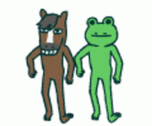 Përshkrimi i përmbajtjes: a horse and frog are standing next to each other holding hands .