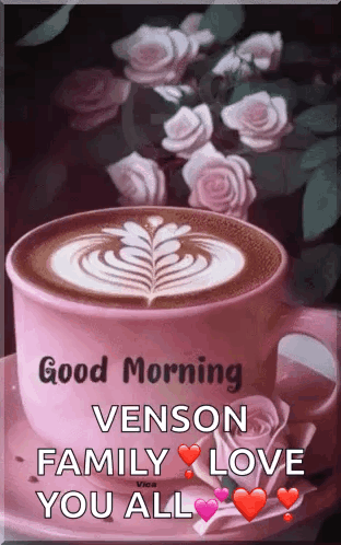 - Përshkrimi i përmbajtjes: a cup of coffee is on a saucer with roses in the background and the words good morning venson family love you all